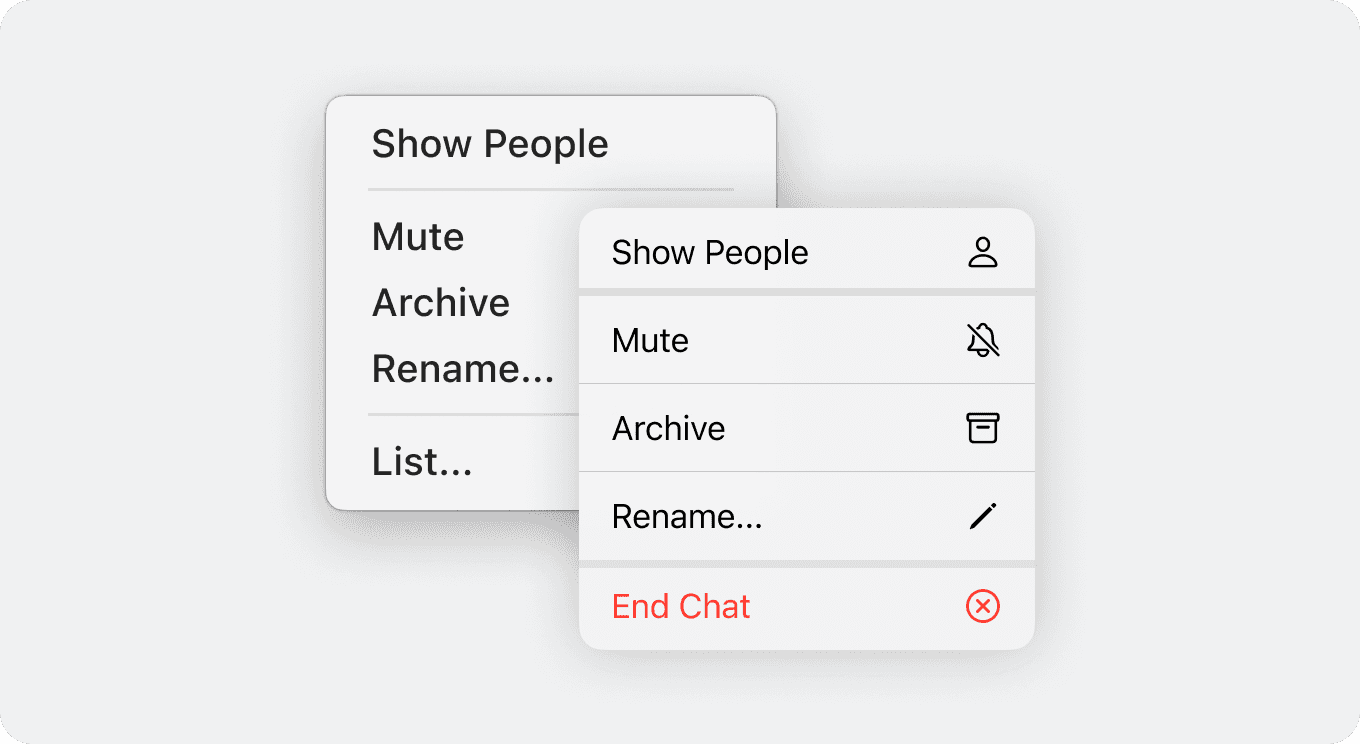 You can also see a contextual menu invoked from the corner of the view to see chat participants and do other things in the chat. This is another part of the user interface that is best done with system standard tools, easy to build and maintain. You will see this pattern more and more in Tact going forward. These menus will contain more features, and there will be more such menus throughout the interface.